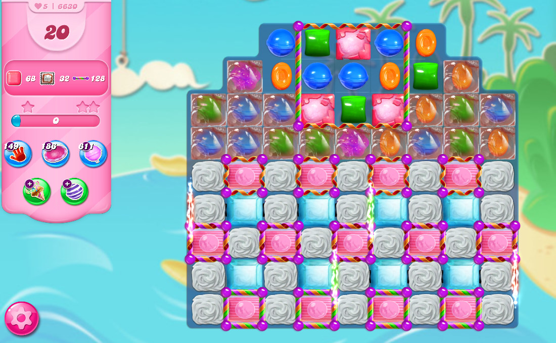 6630關:20步內清除泡泡糖、糖霜與卷形欄柵